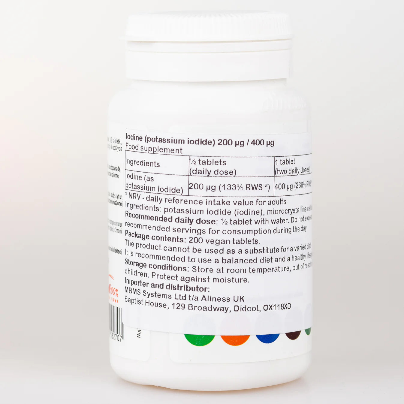 Ten produkt dostarcza jod w postaci jodku potasu , mineralnego źródła jodu stosowanego w suplementach diety. Tabletki są odpowiednie dla wegan i nie zawierają glutenu, laktozy, soi, GMO, sztucznych konserwantów, barwników ani dodatków technologicznych.